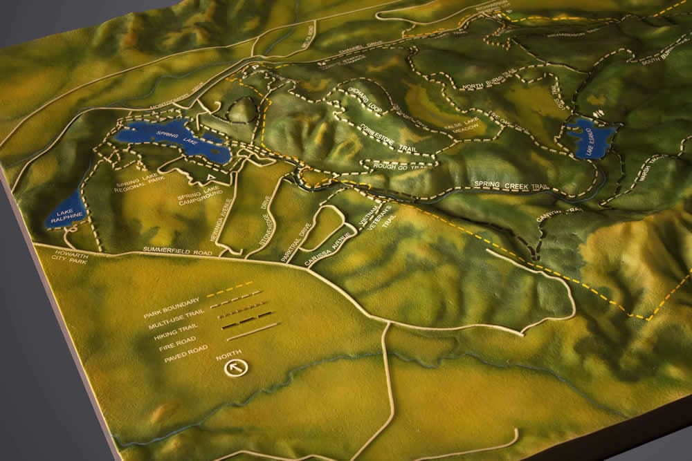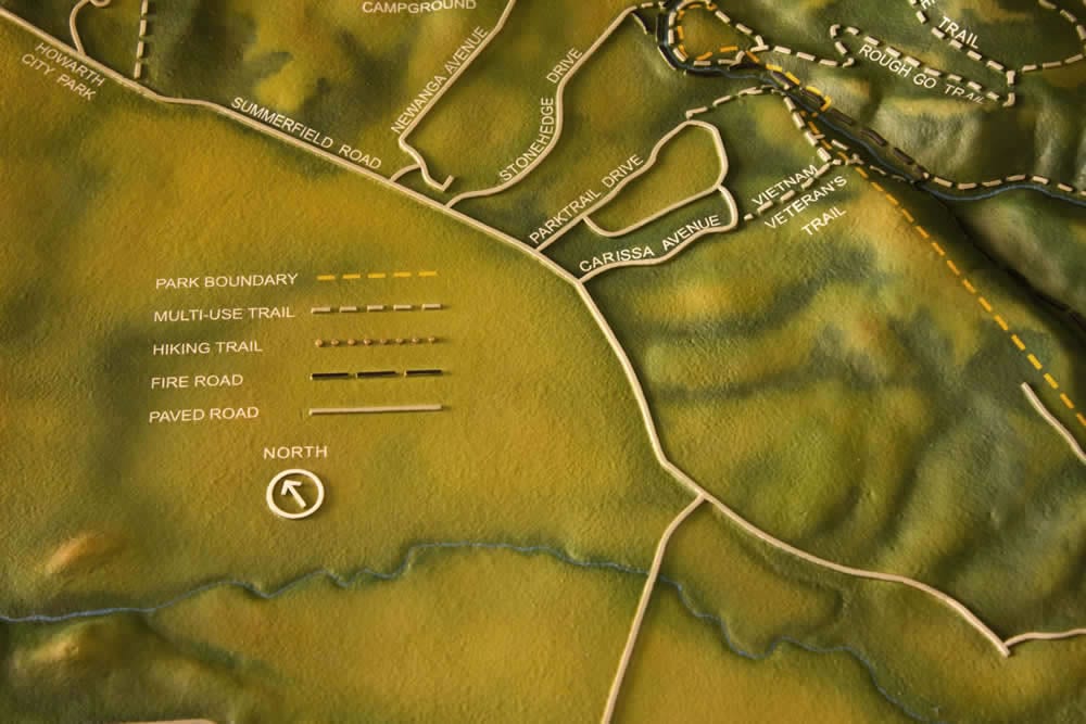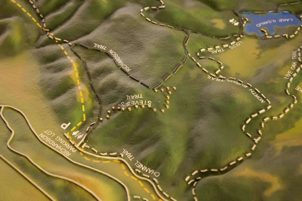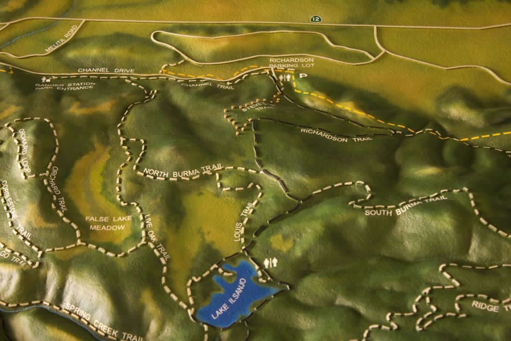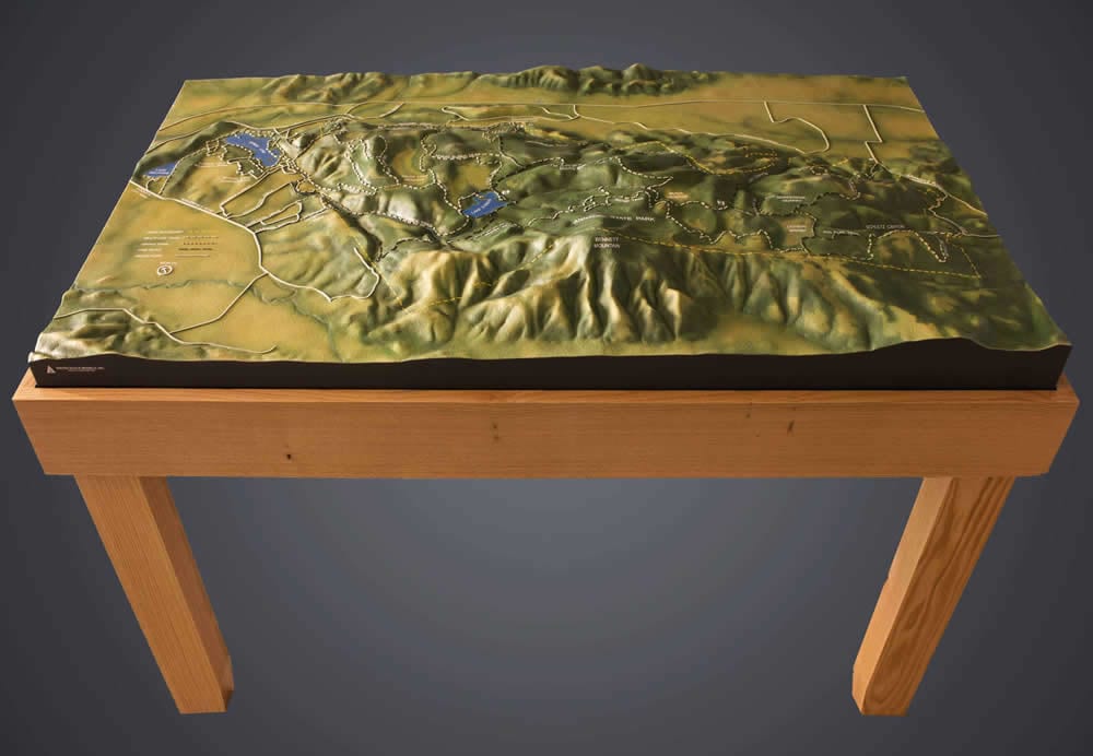 This is a tactile 3d terrain map of the Annadel State Park in California. Basically a trail map in three dimensions, the fiberglass topographic model features raised roads and trails represented as solid lines, dashes, wide dashes, and dots to help differentiate each feature for the vision impaired. We also fabricated the stand for the model from solid fir and finished with 2-part polyurethane.